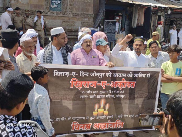 पहलगाम में मारे गए शहीदों को जुमे की नमाज के बाद शाही अटाला मस्जिद के बाहर ताजीयती जलसे में श्रृद्धांजलि दी गयी। भारत सरकार से मांग की गयी की दहशतगर्दो के साथ कोई भी रियायत ना की जाए।