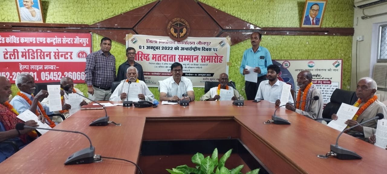 भारत निर्वाचन आयोग के आदेश के क्रम में जिलाधिकारी/ जिला निर्वाचन अधिकारी मनीष कुमार वर्मा के निर्देशानुसार अंतर्राष्ट्रीय वृद्धजन दिवस पर कलेक्ट्रेट सभागार में वरिष्ठ एवं शतायु मतदाता सम्मान समारोह आयोजित हुआ।जिसमें मुख्य अतिथि अपर जिलाधिकारी वित्त एवं राजस्व/ उपजिला निर्वाचन अधिकारी राम प्रकाश ने 80 वर्ष से अधिक आयु के वरिष्ठ मतदाताओं को माल्यार्पण कर भारत निर्वाचन आयुक्त का पत्र प्रदान कर सम्मानित किया।