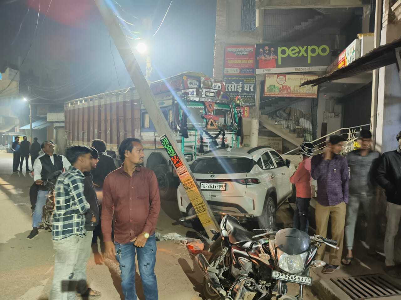 अनियंत्रित ट्रक विद्युत पोल व कार से टकराकर मकान में घुसी