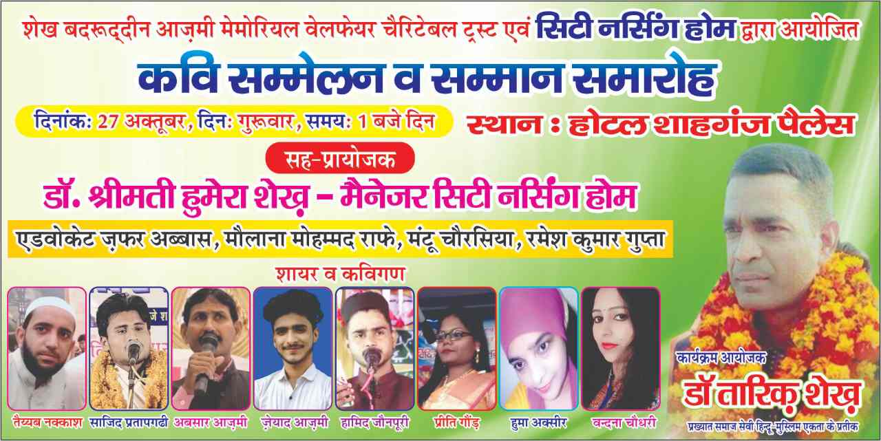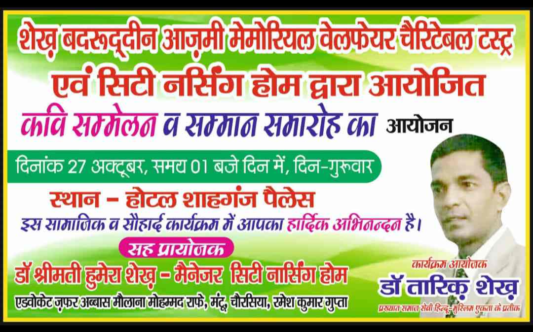 शेख़ बदरुद्दीन आज़मी मेमोरियल वेलफेयर चैरिटेबल ट्रस्ट एवं सिटी नर्सिंग होम के संयुक्त तत्वाधान में आज गुरुवार को कवि सम्मेलन एवं सम्मान समारोह का आयोजन किया गया है।