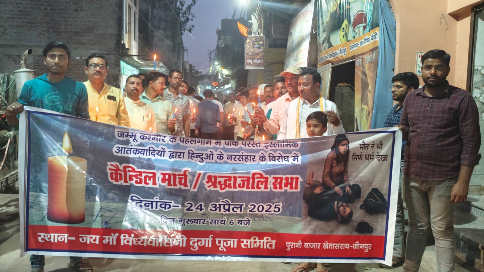 पहलगाम में हुए आतंकी हमले को लेकर लोगों में काफी आक्रोश है। गुरुवार की शाम मां विंध्यवासिनी दुर्गा पूजा समिति की ओर से कैंडल मार्च निकालकर हमले में मृत लोगों को श्रद्धांजलि दी गई। मनीष गुप्ता धर्मरक्षक ने केंद्र सरकार से आतंकियों के विरुद्ध कठोरतम कार्रवाई की मांग की। साथ ही देश की अखंडता एवं सुरक्षा के लिए एकजुट होकर खड़े होने की आवश्यकता पर बल दिया।