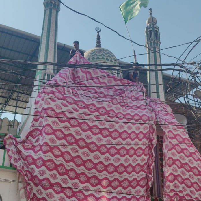 जुलूस मार्ग पर स्थित मस्जिद और मजार को पर्दों से किया गया कवर