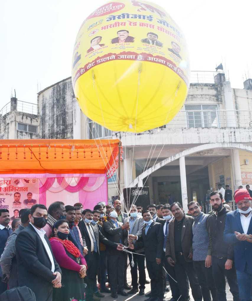 जेसीआई जौनपुर के अध्यक्ष डॉ संदीप पाण्डेय के नेतृत्व में समस्त जेसीआई परिवार के साथ तथा रेडक्रास सोसाइटी के सचिव डॉ मनोज वत्स के संयुक्त प्रयास से रोडवेज परिसर में लोगों को मतदान के प्रति जागरूक करने के उद्देश्य से एक स्काई बैलून लगाया गया। संस्था द्वारा किये गये इस कार्यक्रम का शुभारम्भ जिलाधिकारी/जिला निर्वाचन अधिकारी मनीष वर्मा के हाथों किया गया।मुख्य अतिथि के रूप में जिलाधिकारी श्री वर्मा ने जेसीआई जौनपुर व रेडक्रास सोसाइटी के इस प्रयास की सराहना किया। साथ ही बताया कि प्रजातंत्र में हर व्यक्ति को एक ही मत देने का अधिकार प्राप्त है, इसलिये सबको अपने अधिकार का प्रयोग अवश्य करना चाहिये।
