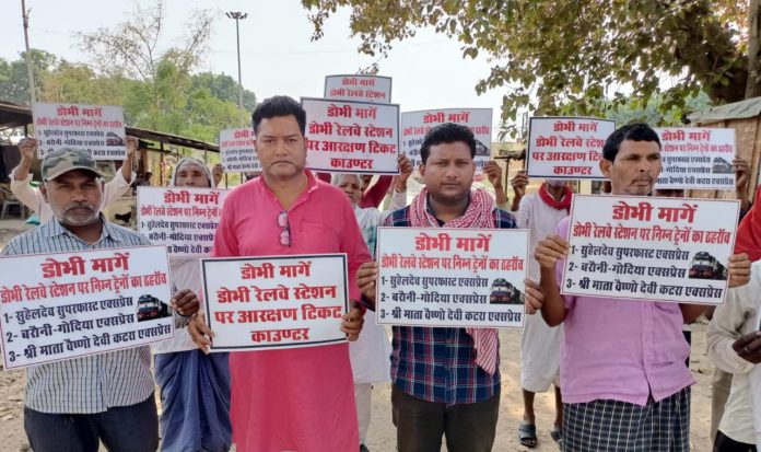 क्षेत्र के डोभी रेलवे स्टेशन पर रविवार की दोपहर समाजसेवी अजीत सिंह के नेतृत्व में सैकड़ों स्थानीय लोगो ने हाथो में बैनर लिए आरक्षण टिकट काउंटर व ट्रेनों के ठहराव के लिए किया प्रदर्शन। गौरतलब हो कि 30 मार्च को सुहेलदेव सुपरफास्ट ट्रेन का ठहराव अचानक रोक दिया गया था रेल विभाग के इस निर्णय से क्षेत्रीय यात्रियों को परेशानियों का सामना करना पड़ रहा है।