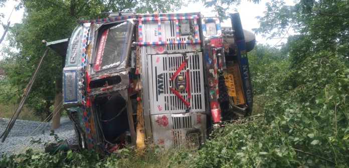जौनपुर : गिट्टी लदी ट्रक सड़क किनारे खंदक में पलटी, चालक घायल