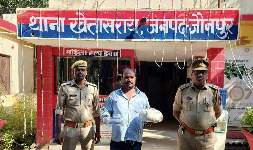थानाध्यक्ष यजुवेंद्र कुमार सिंह ने बताया कि अपराधियों के खिलाफ लगातार अभियान चलाया जा रहा है। इसी अभियान के क्रम में गोवध में वांछित चल रहा शातिर अभियुक्त रानीमऊ नहर के पास चेकिंग के दौरान पुलिस के हत्थे चढ़ गया। पूछताछ में अपना नाम मो. दिलशाद पुत्र स्व. मुस्लिम निवासी रानीमऊ बताया। तलाश के दौरान उसके पास एक किलो तीन सौ ग्राम नाज़ायज़ गाजा, एक अदद 315 बोर तमंचा, एक अदद जिंदा कारतूस व एक मोटरसाइकिल बरामद हुआ। एसओ ने बताया कि गिरफ्तार अभियुक्त बहुत शातिर किस्म का अपराधी है। जिसके विरुद्ध खेतासराय में गोवध निवारण, पशु क्रूरता सहित कई संगीन धाराओं में दर्जनों मुकदमा दर्ज है। टीम में एसओ यजुवेंद्र कुमार सिंह, उपनिरीक्षक शान मोहम्मद, हेड कांस्टेबल दिनेश यादव, कांस्टेबल अमरनाथ, दिनेश सरोज, राजकुमार यादव, सन्दीप कुमार शामिल रहे।