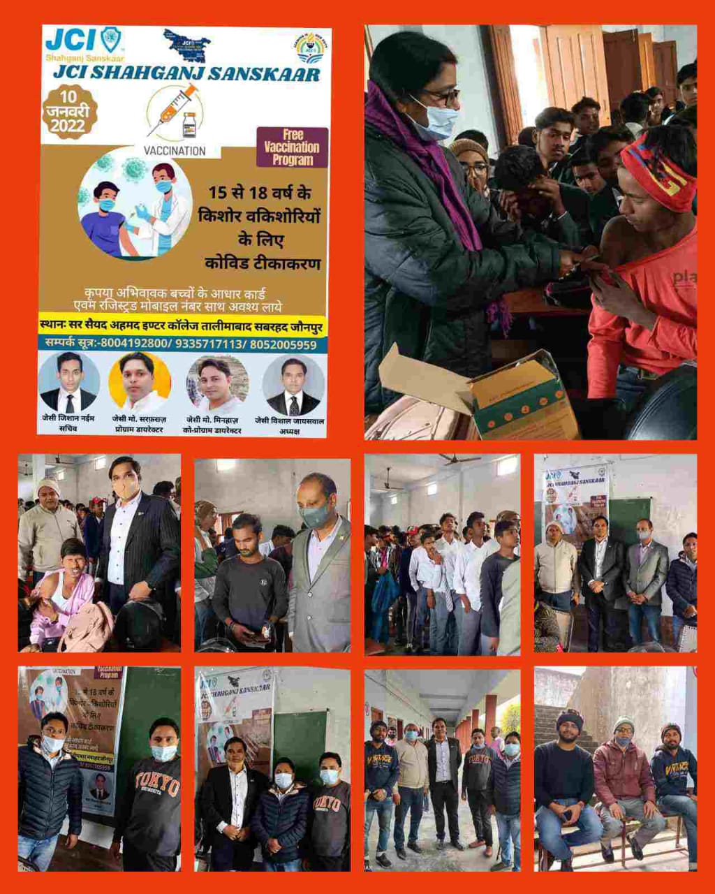 कार्यक्रम के संयोजक जेसीआई संस्कार के उपाध्यक्ष जेसी सरफराज एंव सह संयोजक जेसी मिनहाज इराकी, जेसीआई शाहगंज संस्कार के संस्थापक अध्यक्ष जेसी गुलाम साबिर के कुशल मार्गदर्शन में अध्यक्ष जेसी विशाल जायसवाल की कड़ी मेहनत से यह एक सफल आयोजन हुआ।क्षेत्र के सबरहद मुख्य मार्ग पर स्थित सर सैय्यद इंटर कॉलेज तालीमाबाद में सोमवार को वैक्सीनेशन का जेसीआई शाहगंज संस्कार द्वारा आयोजन किया गया।