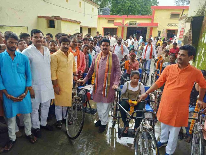 विकास खण्ड बक्शा में विधायक बदलापुर रमेश चन्द्र मिश्र एवं विधान परिषद सदस्य बृजेश सिंह प्रिंशु द्वारा दिव्यांगजनों को 56 अदद ट्राईसाइकिल, 05 अदद व्हीलचेयर, 10 अदद हियरिंग एड, एवं 05 अदद स्मार्ट केन का वितरण किया गया है।