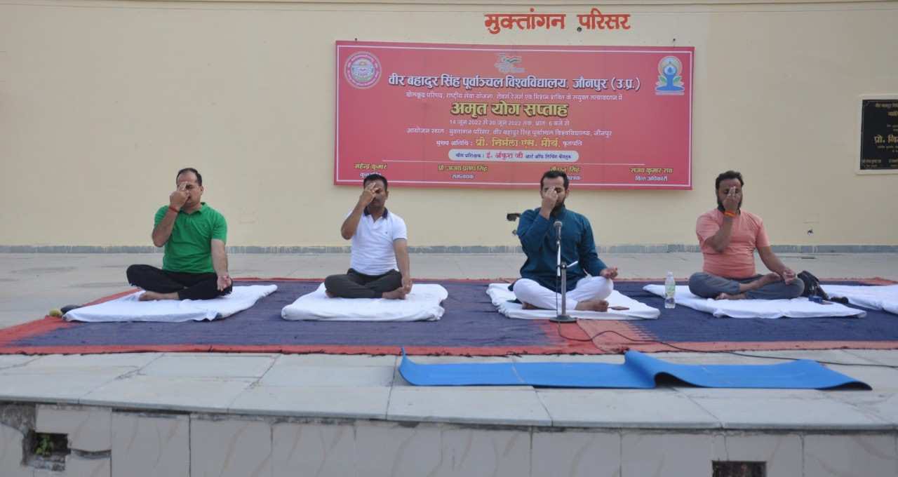 वीर बहादुर सिंह पूर्वांचल विश्वविद्यालय के मुक्तांगन परिसर में खेलकूद परिषद, राष्ट्रीय सेवा योजना, रोवर्स रेंजर एवं मिशन शक्ति के संयुक्त तत्वावधान में शनिवार को अमृत योग सप्ताह के पांचवें दिन कुलसचिव समेत विश्वविद्यालय के अधिकारी, शिक्षक और कर्मचारियों ने प्रतिभाग किया। कुलपति प्रो. निर्मला एस. मौर्य के निर्देशन में यह कार्यक्रम चल रहा है।