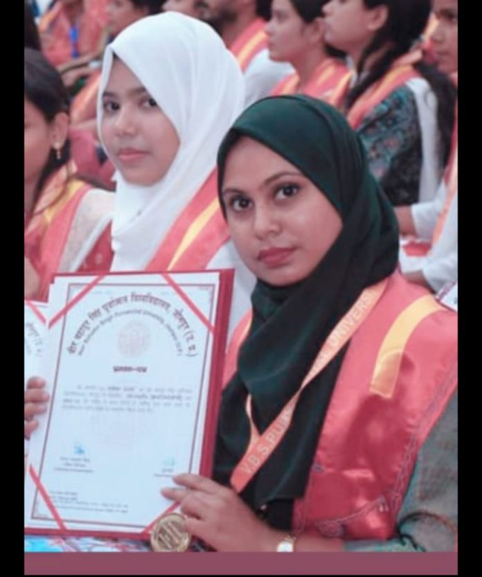 सामाजिक संस्था मदर निसा फाउंडेशन के संस्थापक सदस्य जमील अहमद की पुत्री तूबा जमील को पूर्वांचल विश्व विद्यालय के 27वें दीक्षांत समारोह में उत्तर प्रदेश की राज्यपाल महामहिम आनंदीबेन पटेल ने एमएससी माईक्रो बायोलॉजी में सर्वोच्च अंक प्राप्त करने के लिए गोल्डमेडल और प्रशस्तिपत्र पत्र देकर सम्मानित किया। तूबा जमील को सम्मानित करने की खबर जब उनसे घर पूर्वी कौड़िया जब पहुॅंची तो बधाई देने वालों का तांता लग गया। तूबा जमील की इस कामयाबी पर पूरा क्षेत्र गौरवान्वित महसूस कर रहा है।