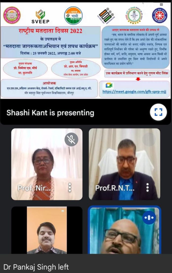 वीर बहादुर सिंह पूर्वांचल विश्वविद्यालय जौनपुर के एनएसएस, रोवर्स-रेंजर्स, एक्टिविटी क्लब, आईक्यूएसी एवं महिला अध्ययन केंद्र के सहयोग से राष्ट्रीय मतदाता दिवस के अवसर पर एक दिवसीय वेबिनार का आयोजन हुआ।इस वेबिनार में अपने अध्यक्षीय उद्बोधन में कुलपति प्रोफेसर निर्मला एस. मौर्य ने कहा कि सचेत मतदाता सशक्त लोकतंत्र के प्रहरी हैं।