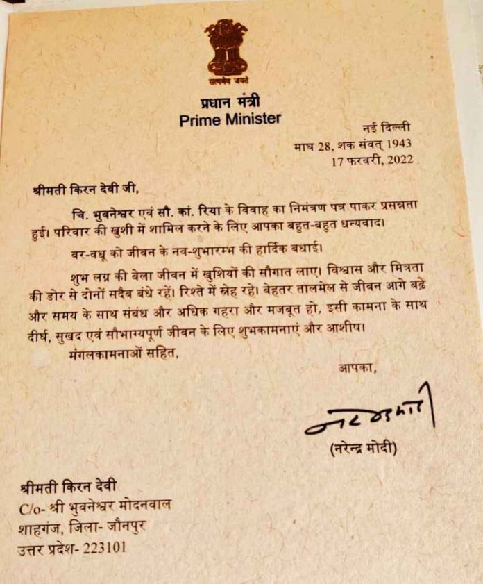 जौनपुर : सभासद भुवनेश्वर के विवाह पर मोदीजी ने भेजा आशीष पत्र