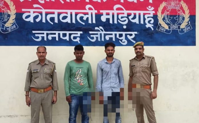 अपराध एवं अपराधियों के विरुद्ध चलाये जा रहे विशेष अभियान के क्रम में क्षेत्राधिकारी मडियाहूं के निर्देशन में थानाध्यक्ष मड़ियाहूं के नेतृत्व में उप निरीक्षक कश्यप कुमार सिंह अपने हमराहियों के साथ रविवार की रात क्षेत्र में भ्रमण कर रहे थे तभी मुखबिर की सूचना पर ओम साई फिलिंग स्टेशन जमालापुर से मोबाइल चोरी करने वाले दो अभियुक्तों सचिन कन्नौजिया पुत्र योगेन्द्र कन्नौजिया निवासी अलाबक्शपुर, मोकलपुर थाना मडियाहूं एंव सूरज दुबे पुत्र ओमकारनाथ दुबे निवासी सेल्हुआपार थाना मडियाहूं को गिरफ्तार किया गया। जिनके पास से चोरी की मोबाइल, 2 किलो 150 ग्राम अवैध गांजा एंव चोरी में प्रयुक्त बाइक बरामद किया गया है। बरामदगी एंव गिरफ्तारी के आधार पर सुसंगत धाराओं के मुकदमा पंजीकृत कर चालान न्यायालय भेज दिया गया।
