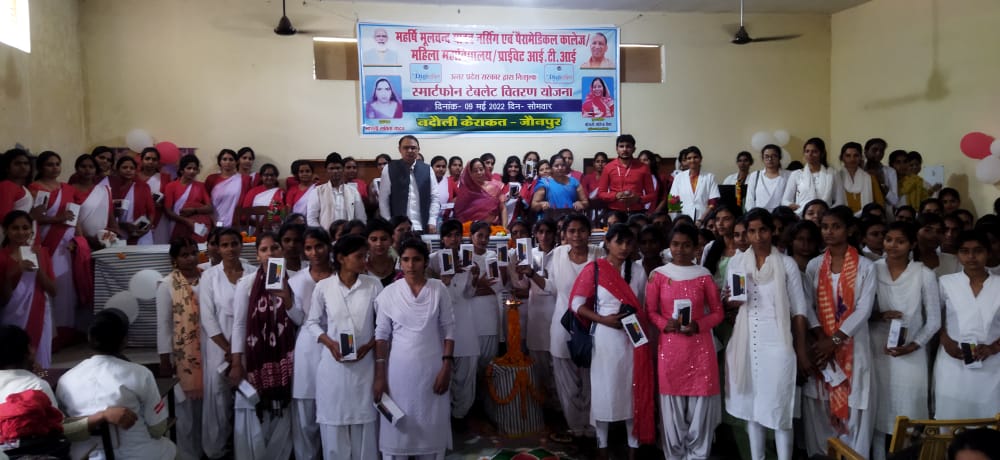 महर्षि मूलचंद यादव नर्सिंग पैरामेडिकल कालेज, महिला महाविद्यालय व आईटीआई कालेज नदौली में 150 छात्र-छात्राओं को स्मार्ट फोन व टैबलेट को मुख्य अतिथि पूर्व प्रमुख केराकत सरिता सिंह ने वितरित किया।