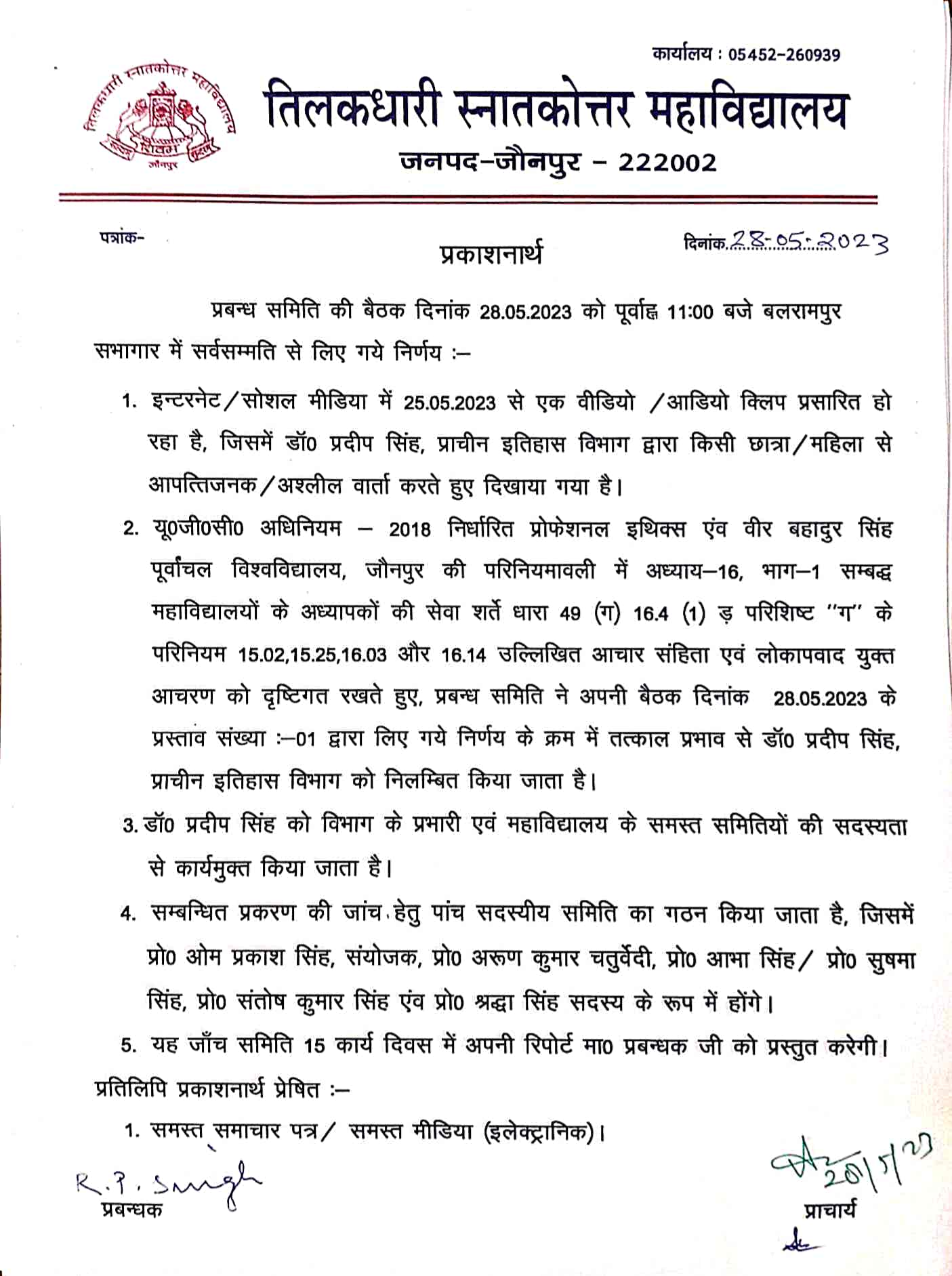 गौरतलब है कि बीते 25 मई की शाम से सोशल मीडिया में टीडी कालेज के प्रचीन इतिहास विभाग के एचओडी डॉ प्रदीप सिंह का एक वीडियों सोशल मीडिया में तेजी से वायरल हो रहा है। वीडियो में आरोपी शिक्षक एक छात्रा को बीएड कराने तथा टीईटी परीक्षा पास करने का लालच देकर उसके साथ अश्लील भाषा का प्रयोग करते हुए छात्रा से अंतरंग संबंध बनाने की डिमांड कर रहा है इसके अलावा तमाम तरह की आपत्तिजनक बाते कह रहे हैं।