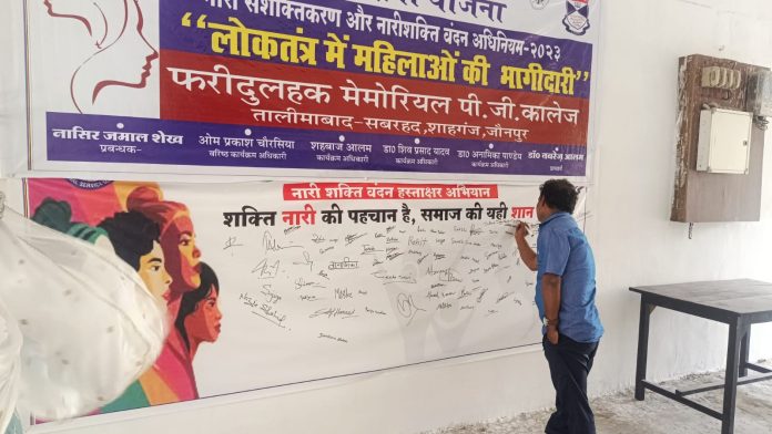 नारी सशक्तिकरण को बढ़ावा देने के उद्देश्य से नारी शक्ति वंदन अधिनियम 2023 के अंतर्गत फरीदुल हक़ मेमोरियल पीजी कॉलेज सबरहद में हस्ताक्षर अभियान का आयोजन किया गया।कार्यक्रम का शुभारंभ कॉलेज के प्राचार्य डॉ. तबरेज़ आलम ने हस्ताक्षर कर किया।