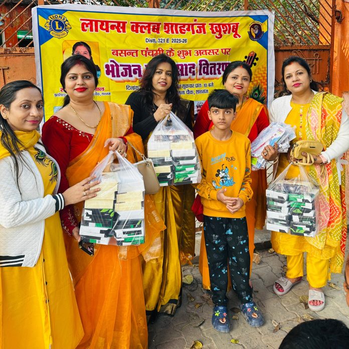 बसंत पंचमी के पावन अवसर पर लायंस क्लब शाहगंज खुशबू द्वारा सेवा भावना के तहत प्रसाद एवं भोजन वितरण का आयोजन किया गया। कार्यक्रम नगर के पुराना चौक मोहल्ला स्थित एक स्कूल परिसर तथा मालिन बस्ती में आयोजित हुआ।कार्यक्रम का उद्देश्य जरूरतमंद लोगों को भोजन व प्रसाद उपलब्ध कराकर सामाजिक सहयोग एवं सेवा भावना को प्रोत्साहित करना रहा।