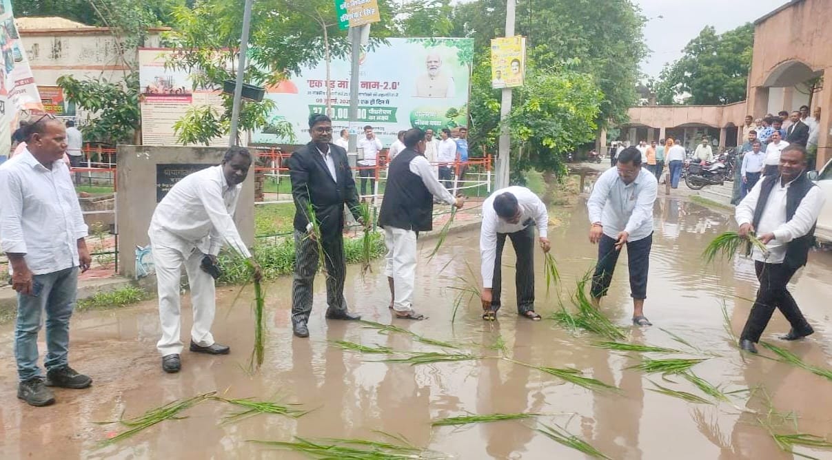 बारिश से जलमग्न हुआ तहसील परिसर, वकीलों ने की धान की रोपाई