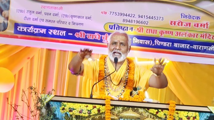 पिंडरा बाजार स्थित श्री राधे कुंज प्रांगण में चल रही श्रीमद्भागवत कथा में श्रद्धालु भक्ति रस में डूबकर प्रवचन का रसपान कर रहे हैं।कथा स्थल पर प्रतिदिन भारी संख्या में श्रद्धालुओं की भीड़ उमड़ रही है।सात दिवसीय कथा के पांचवें दिन आचार्य परमानंद पाठक महाराज ने अपने प्रवचन में कहा कि“नंद के घर आनंद”का अर्थ केवल उत्सव नहीं,बल्कि वह स्थिति है जब मनुष्य अपने जीवन से दूसरों को सुख और आनंद प्रदान करता है।