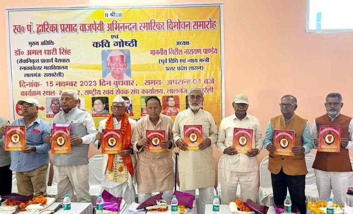 राष्ट्रीय स्वयंसेवक संघ कार्यालय लालगंज में शिक्षक स्व. पं. द्वारिका प्रसाद वाजपेई अभिनन्दन स्मारिका का विमोचन समारोह पूर्व विधि एवं न्याय मंत्री उत्तर प्रदेश शासन गिरीश नारायण पाण्डेय की अध्यक्षता में संपन्न हुआ। कार्यक्रम की शुरुआत मां सरस्वती व पं. द्वारिका प्रसाद वाजपेई के चित्र पर मुख्य अतिथि डा. अमलधारी सिंह व कार्यक्रम के अध्यक्ष पूर्व विधि एवं न्याय मंत्री गिरीश नारायण पाण्डेय ने आरएसएस धर्म जागरण संयोजक सुशील शुक्ला के साथ मिलकर माल्यार्पण व दीप प्रज्वलित कर किया।