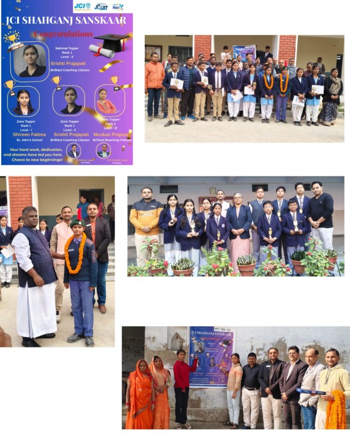 जेसीआई शाहगंज संस्कार के पदाधिकारियों ने कहा कि यह सफलता विद्यार्थियों की मेहनत के साथ उनके अभिभावकों, शिक्षकों और विद्यालय प्रबंधन के सामूहिक प्रयासों का परिणाम है।यह उपलब्धि पूरे नगर के लिए प्रेरणास्रोत है।इस अवसर पर जोन कोऑर्डिनेटर एवं JCSAT टास्कफोर्स सदस्य जेएफएम गुलाम साबिर, जोन कोऑर्डिनेटर जेएफएम सीए बिजेंद्र अग्रहरि, सचिव जेसी मिन्हाज इराकी, जेसी अखिलेश कुमार एवं जेसी कुशाग्र अग्रहरि उपस्थित रहे।