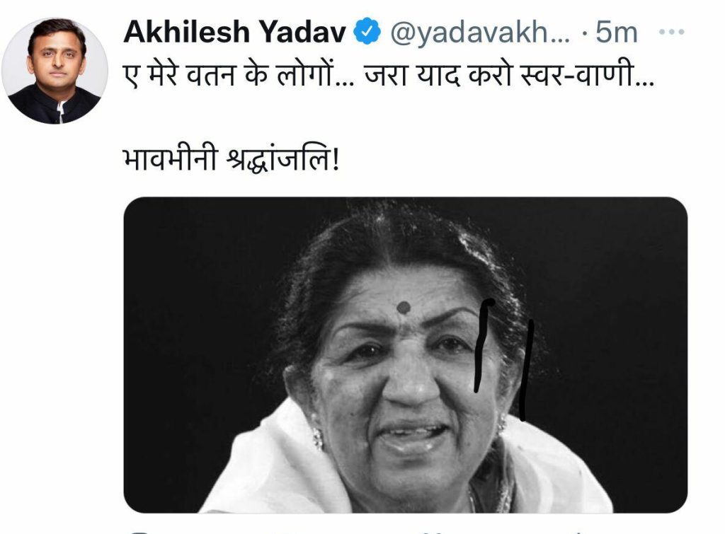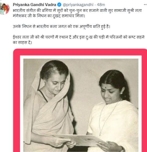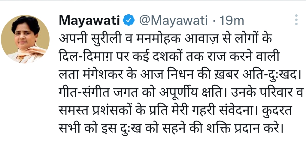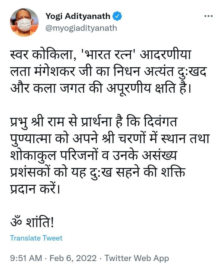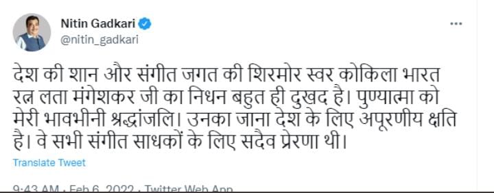 स्वर कोकिला लता मंगेशकर जी के निधन की खबर आते ही पूरा देश व फिल्म जगत गहरे शोक में डूब गया। राष्ट्रपति रामनाथ कोविंद, प्रधानमंत्री नरेंद्र मोदी, गृह मंत्री अमित शाह, यूपी के मुख्यमंत्री योगी आदित्यनाथ, विपक्ष के तमाम बड़े नेताओं, राज्यों के मुख्यमंत्रियों, राज्यपालों ने उनके निधन पर गहरा दुख व्यक्त किया है। देश ही नहीं विदेश से भी बड़ी संख्या में शोक संदेश लगातार मिल रहे हैं। लता जी के निधन पर केंद्रीय मंत्री नितिन गडकरी ने कहा कि देश की शान और संगीत जगत की शिरमोर स्वर कोकिला भारत रत्न लता मंगेशकर जी का निधन बहुत ही दुखद है। मुंबई के शिवाजी पार्क में लता मंगेशकर की अंतिम क्रिया होगी। पूरे राजकीय सम्मान के साथ उनका अंतिम संस्कार किया जाएगा।