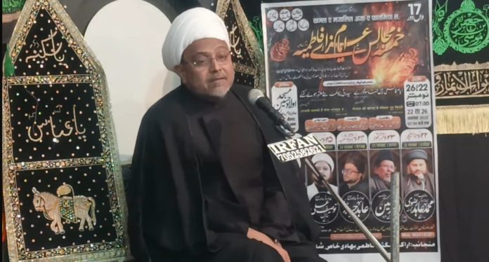 उन्होंने मोहम्मद साहब की हदीस बयान करते हुए बताया कि फ़ातिमा अपने बाप की मां हैं। मौलाना ने हज़रत फ़ातिमा पर हुए अत्याचारों का जिक्र किया तो उपस्थित लोगों की आंखें नम हो गईं। माहौल ग़मगीन हो उठा और लोगों ने इमाम-ए-वक़्त को पुरसा पेश किया। मजलिस के बाद नौहा व मातम हुआ।